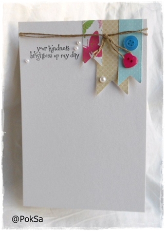 Ein paar kleine Fähnchen, Paketband, Stempel, Perlen, Knöpfe. Schon etwas mehr als vielleicht bei Clean & Simple, aber bei dieser Technik darf es das auch.